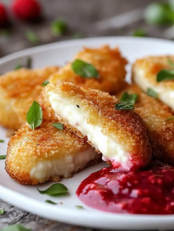 Knusprig frittierte Briespalten mit Himbeer-Sahnesauce