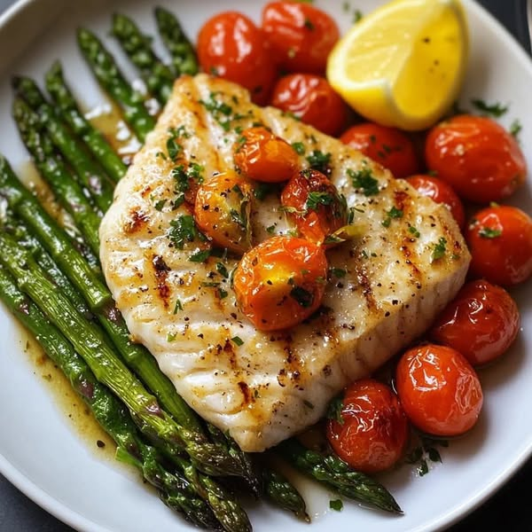 Knoblauchbutter-Weißfisch mit geröstetem Spargel und Kirschtomaten